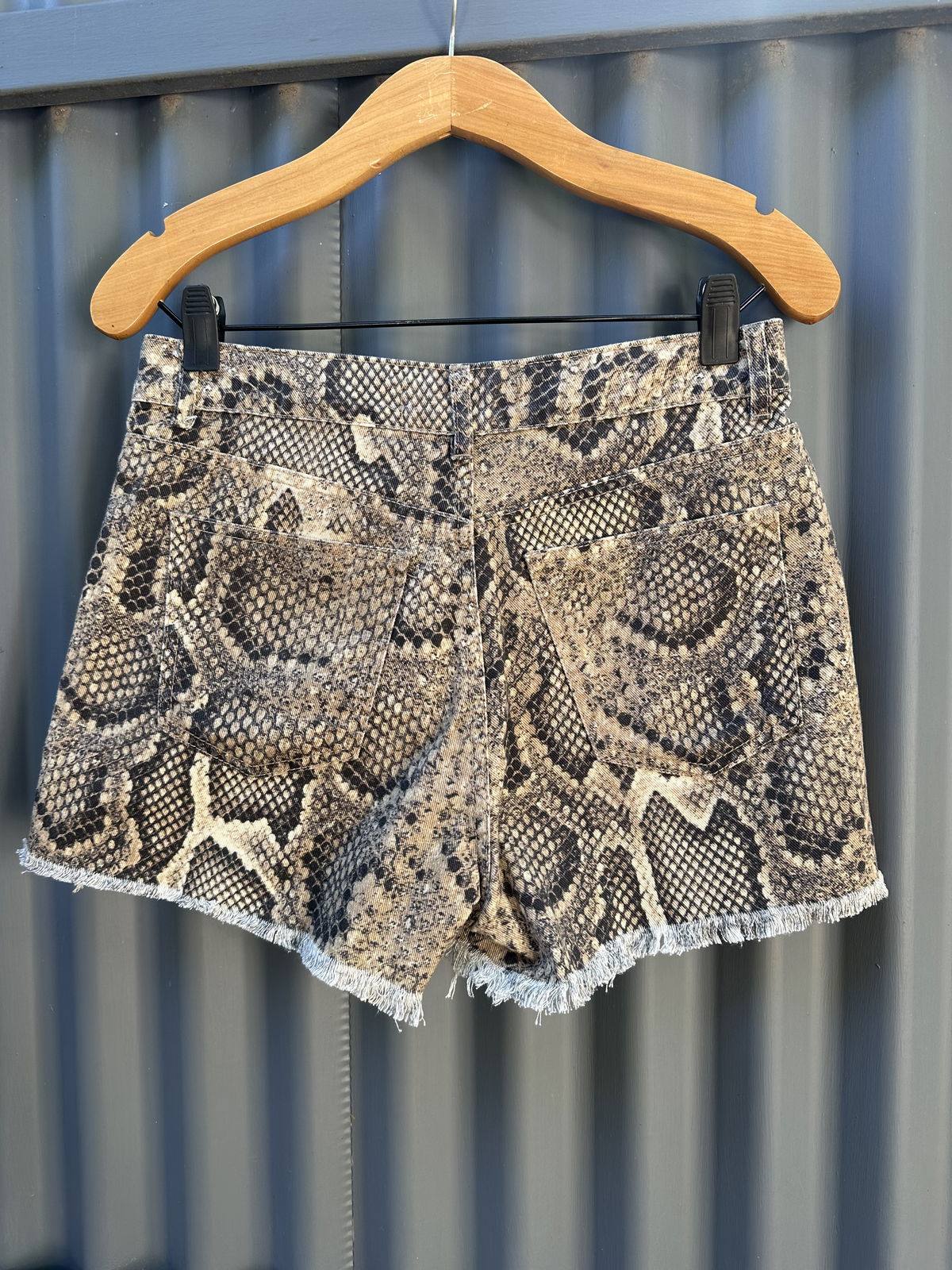 • Short de jean reptil, desflecado y con aberturas en los laterales.