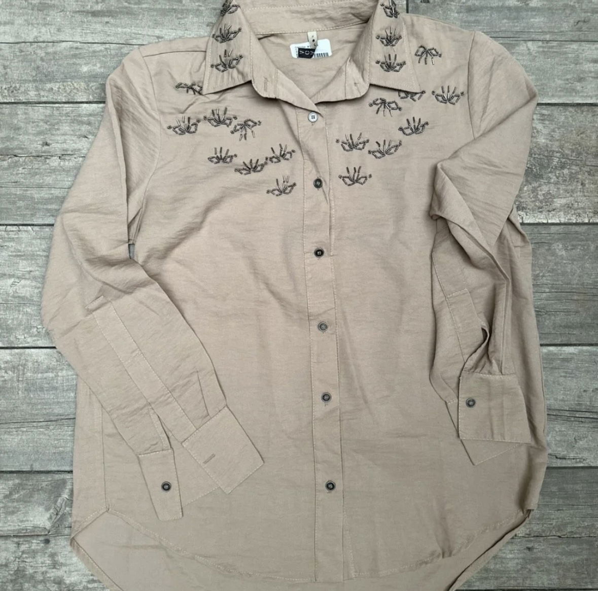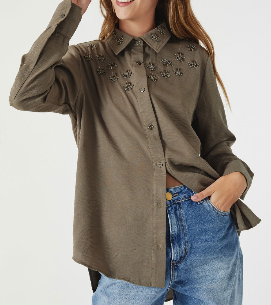 • Camisa larga con bordado de canutillos y mostacillas