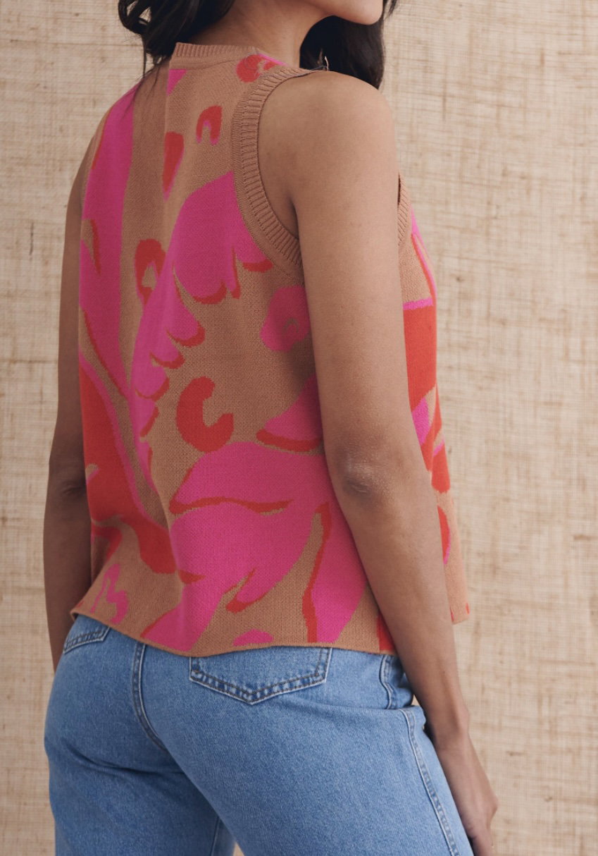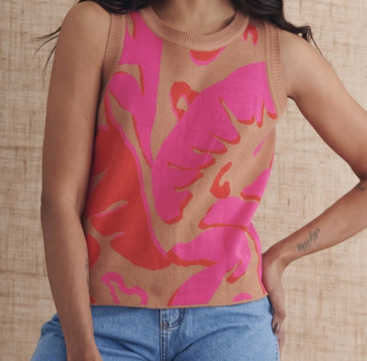 Musculosa tejida en hilo con lycra, súper cómoda y con estampados XL que levantan cualquier look. Se adapta al cuerpo y tiene ese mix perfecto entre frescura y diseño. Ideal para usar con jeans, pantalones amplios o mini, siempre con onda y personalidad.