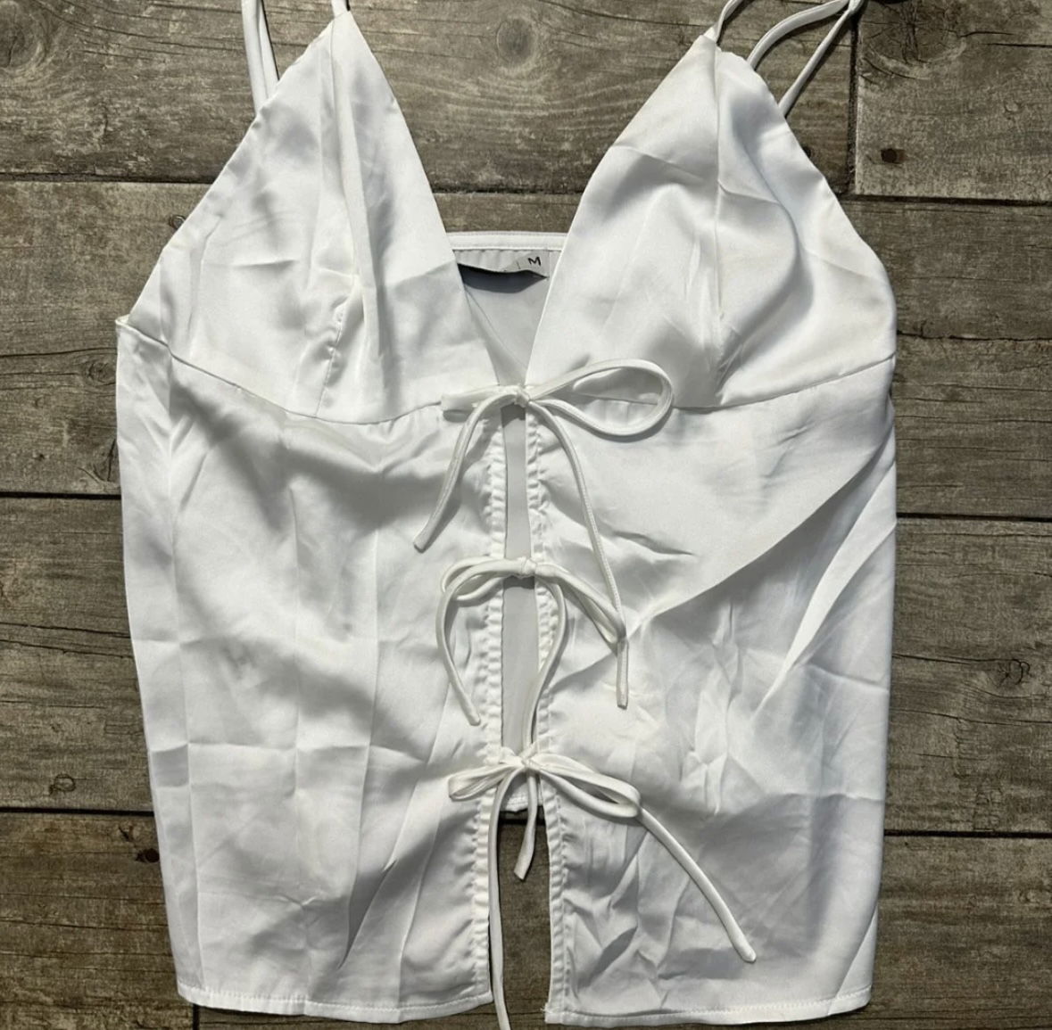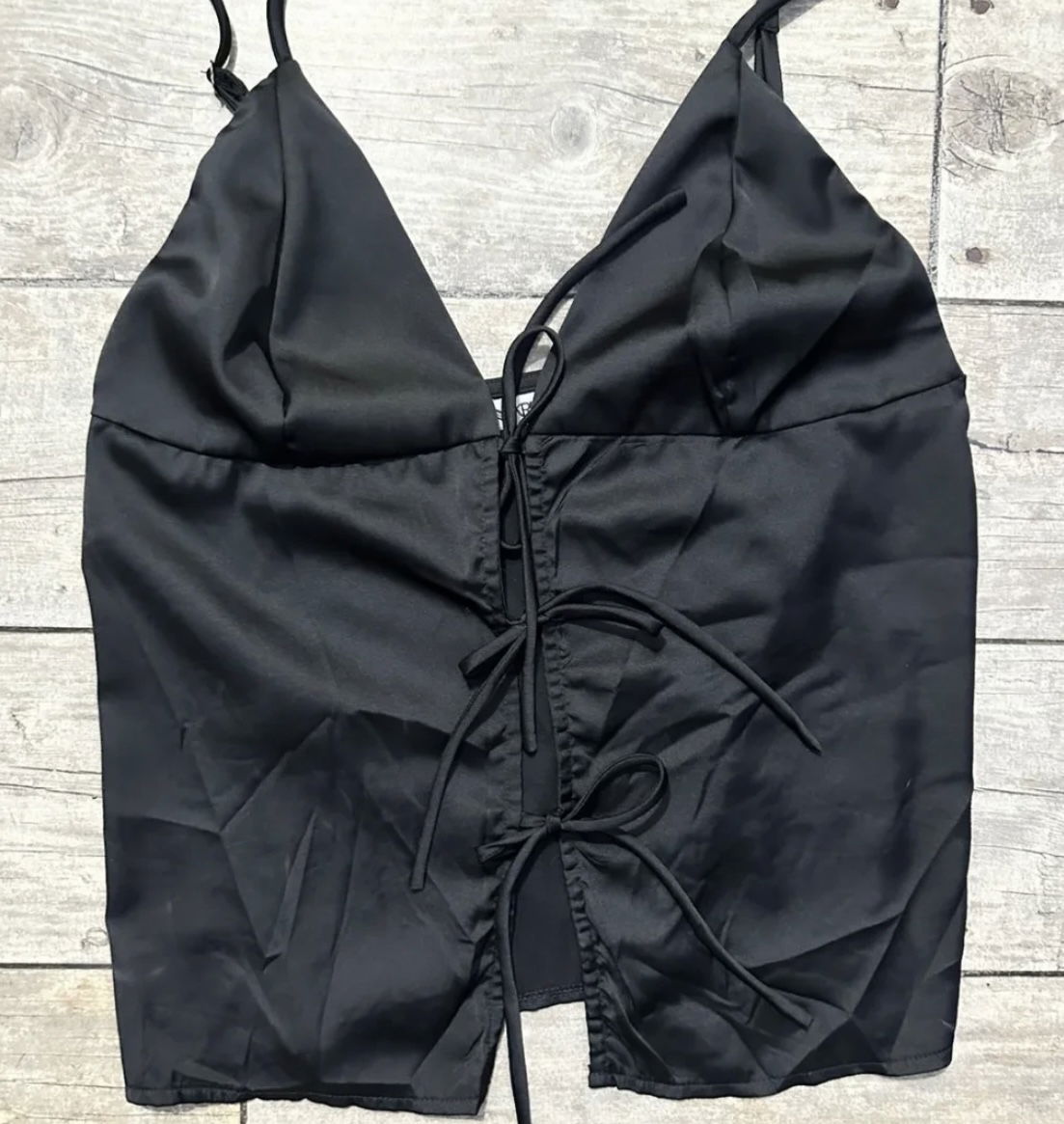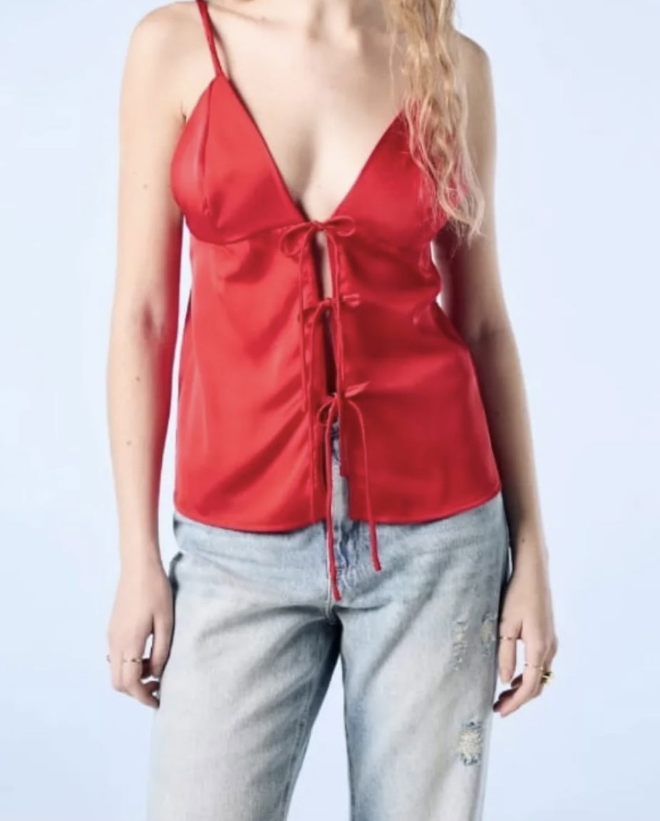 • Musculosa de satén con breteles finos y lazos delanteros que encienden cualquier look. Sexy, audaz y con ese brillo que atrapa miradas. Ideal para salir de noche o para darle un giro explosivo a tu outfit casual.