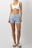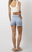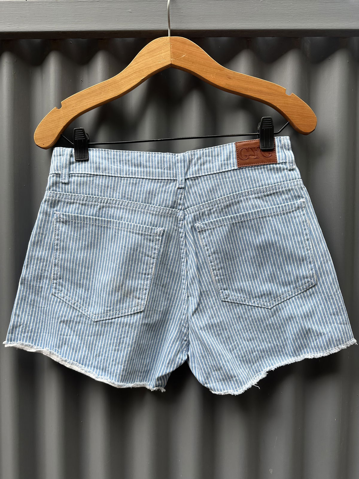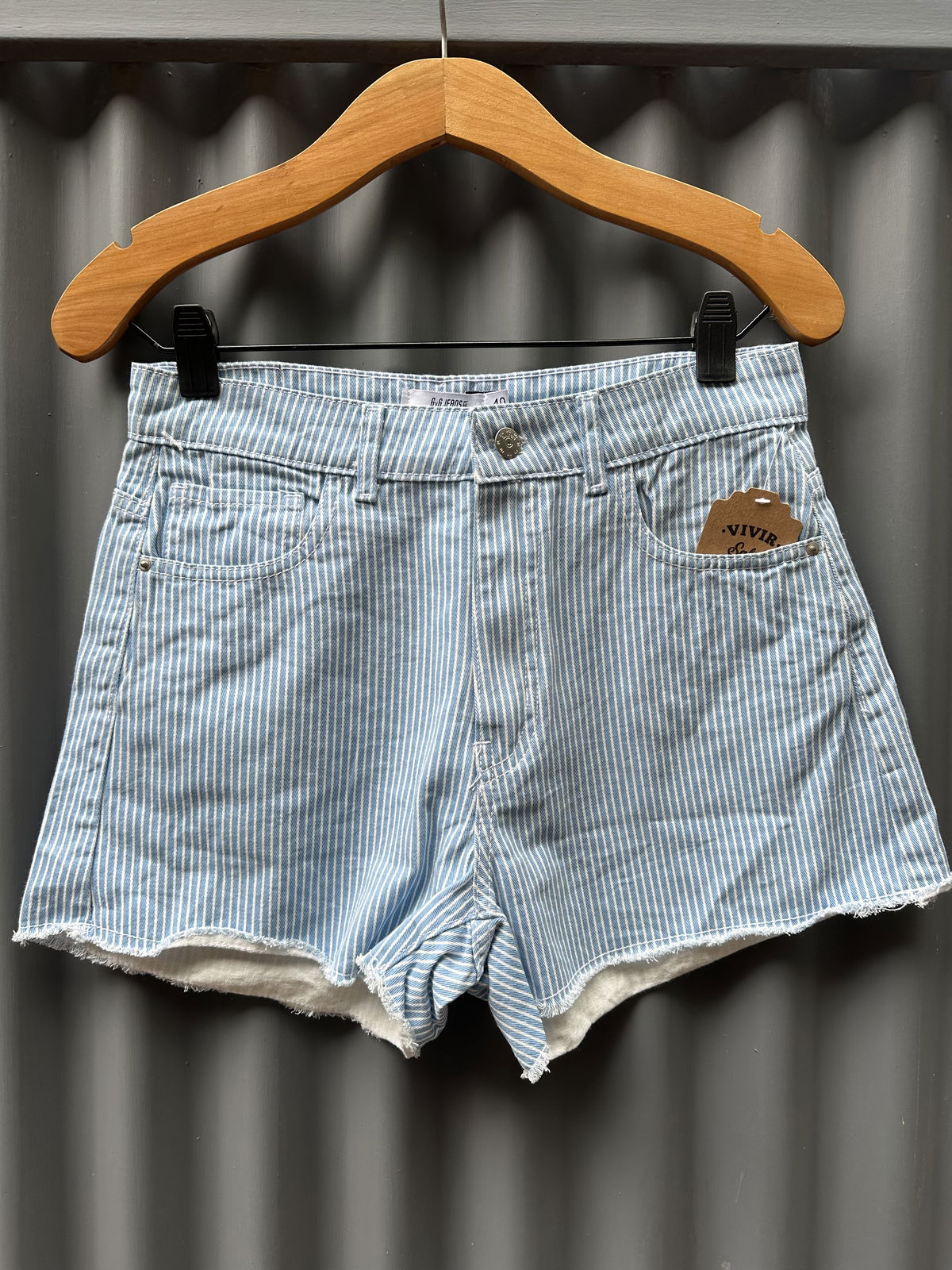 Celeste con rayitas blancas – fresco, corte relajado y con onda. Con ruedo desflecado y bolsillos delanteros.