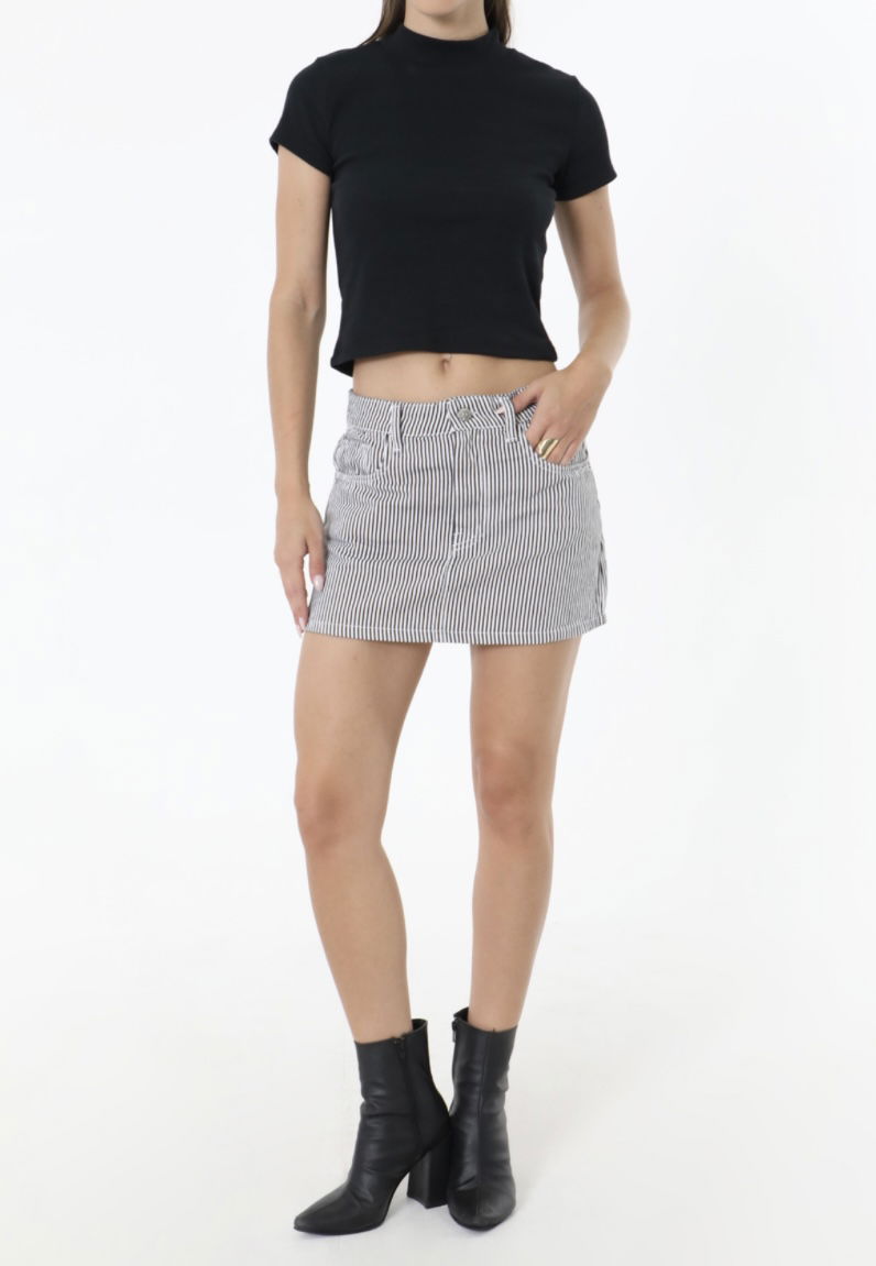 Mini rayada – blanco y negro que nunca falla. Bolsillos, corte justo y actitud para todos los días.