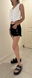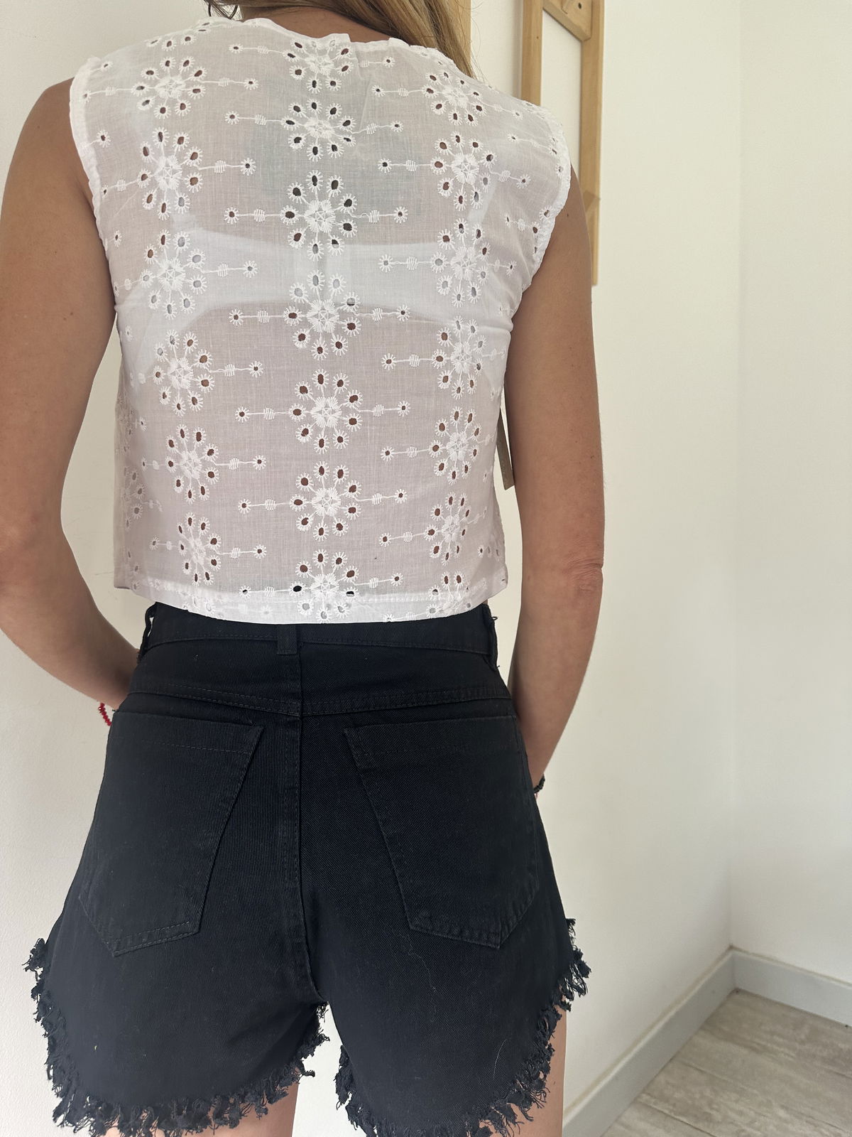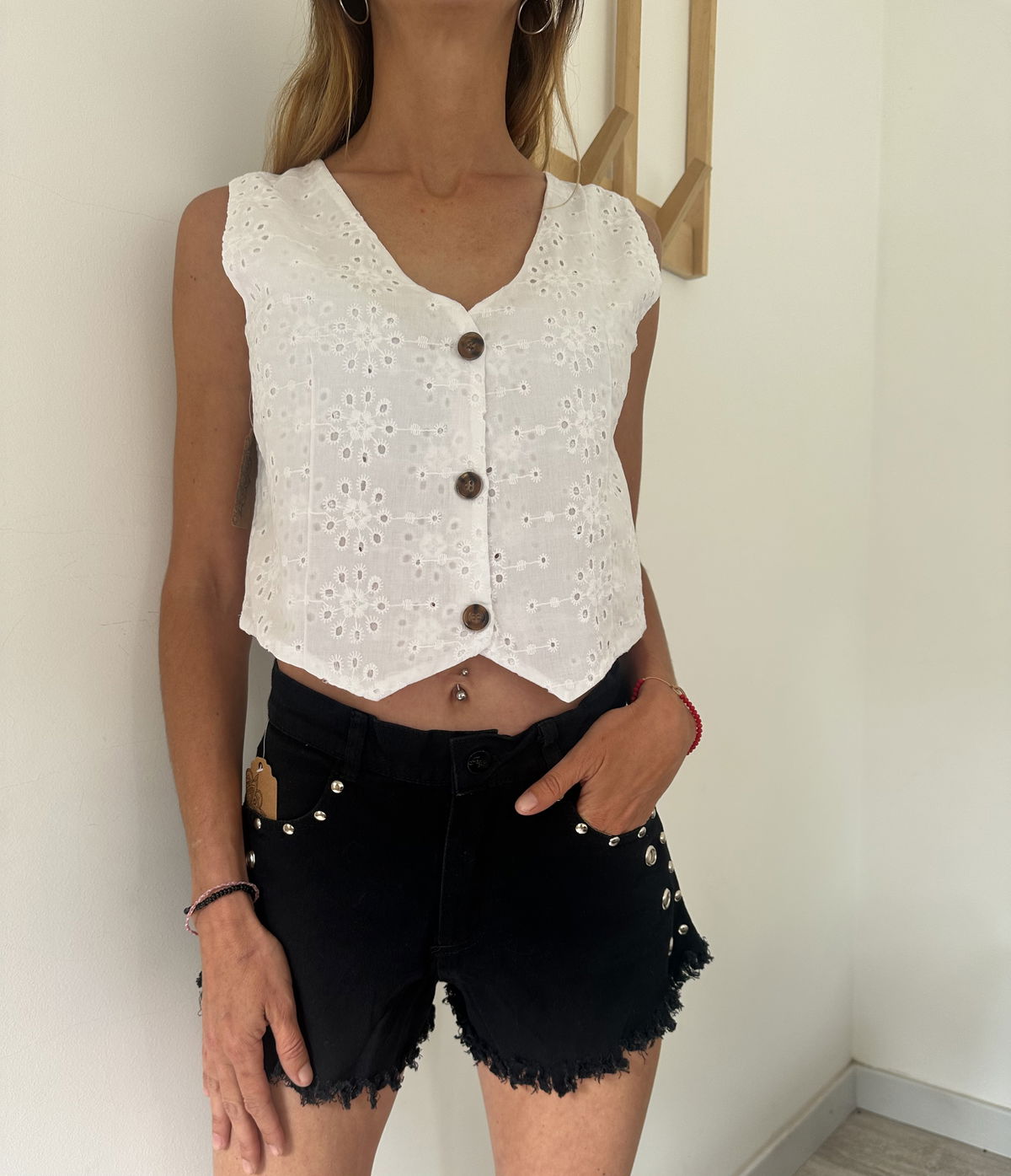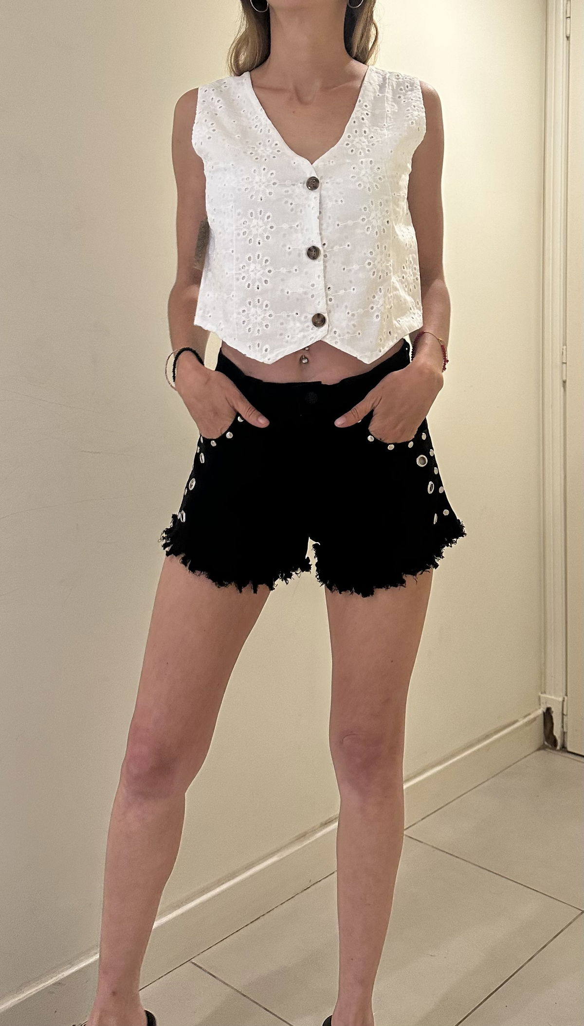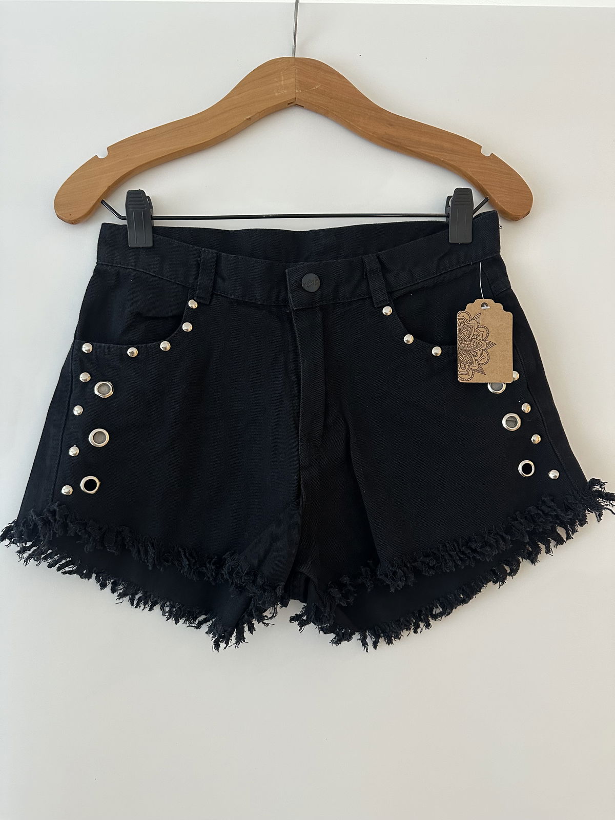 • Short negro de jean con tachas y argollitas. Rígido, tiro alto y con bolsillos delanteros!