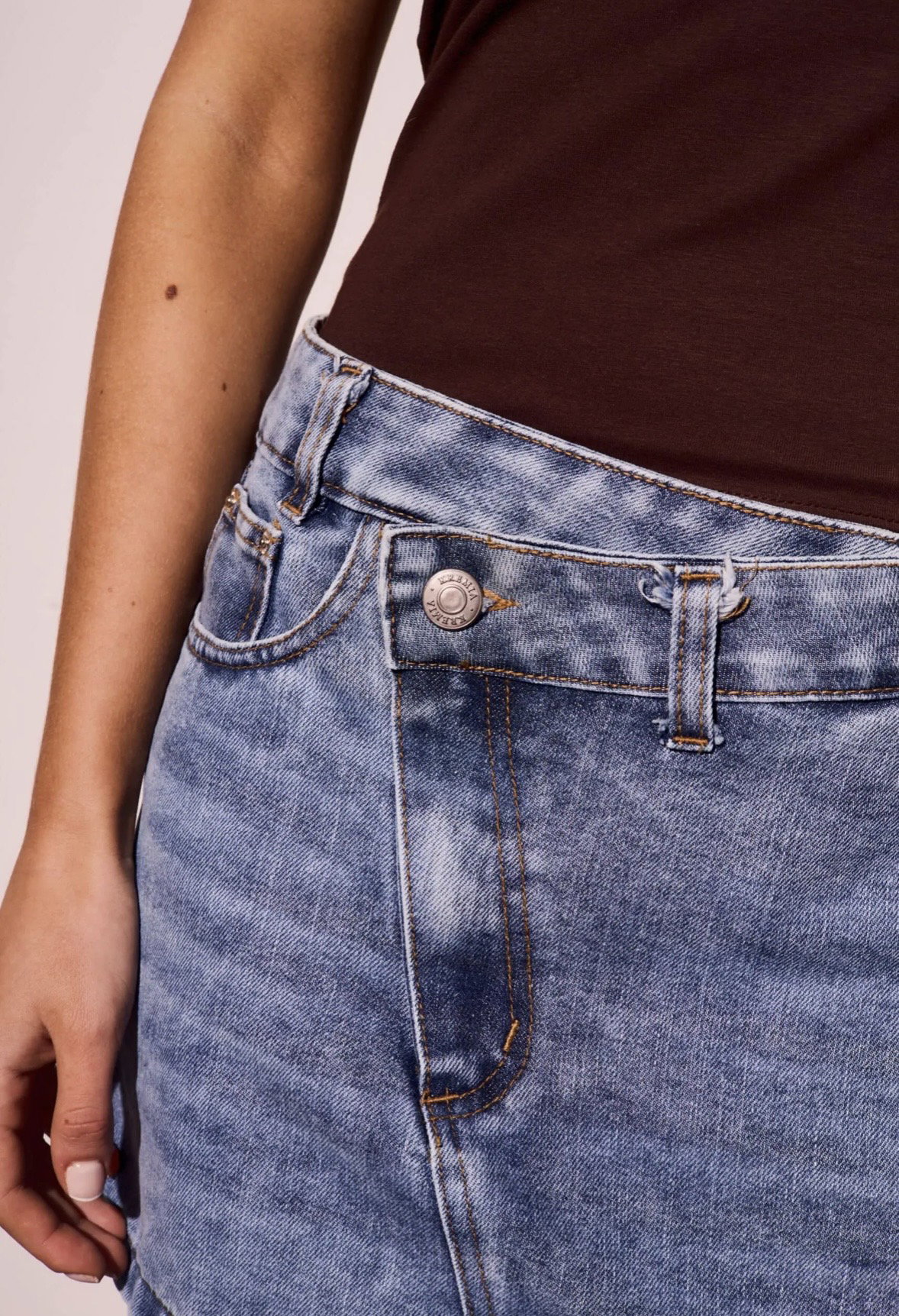 Un clásico con un giro moderno ✨ Esta pollera de jean se destaca por su cintura asimétrica con botón lateral, un detalle de diseño que la hace diferente y le suma mucha personalidad.