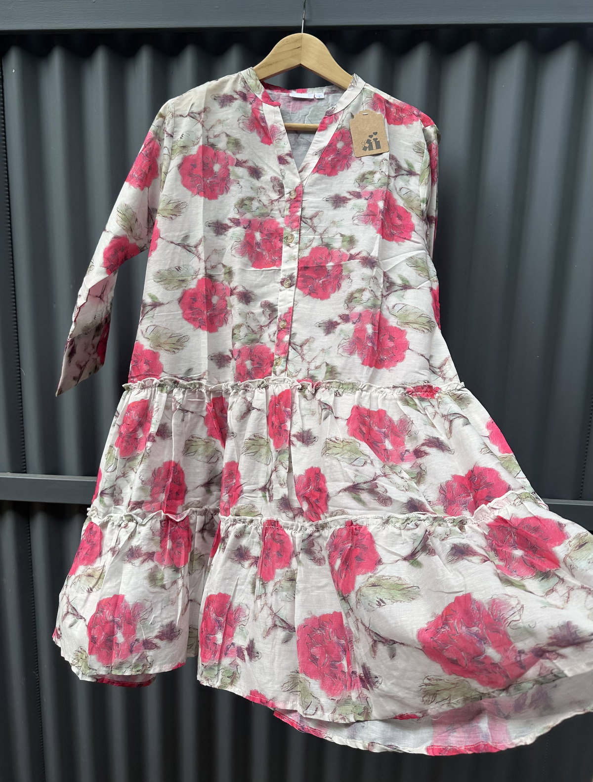 Tela liviana de tacto suave tipo rayón, y con un aire romántico que enamora. Su estampa floral llena de color se combina con un diseño femenino de volados en capas que aporta movimiento y frescura. Las mangas con puños tipo camisero y los botones delanteros suman un detalle delicado que lo hace todavía más especial.