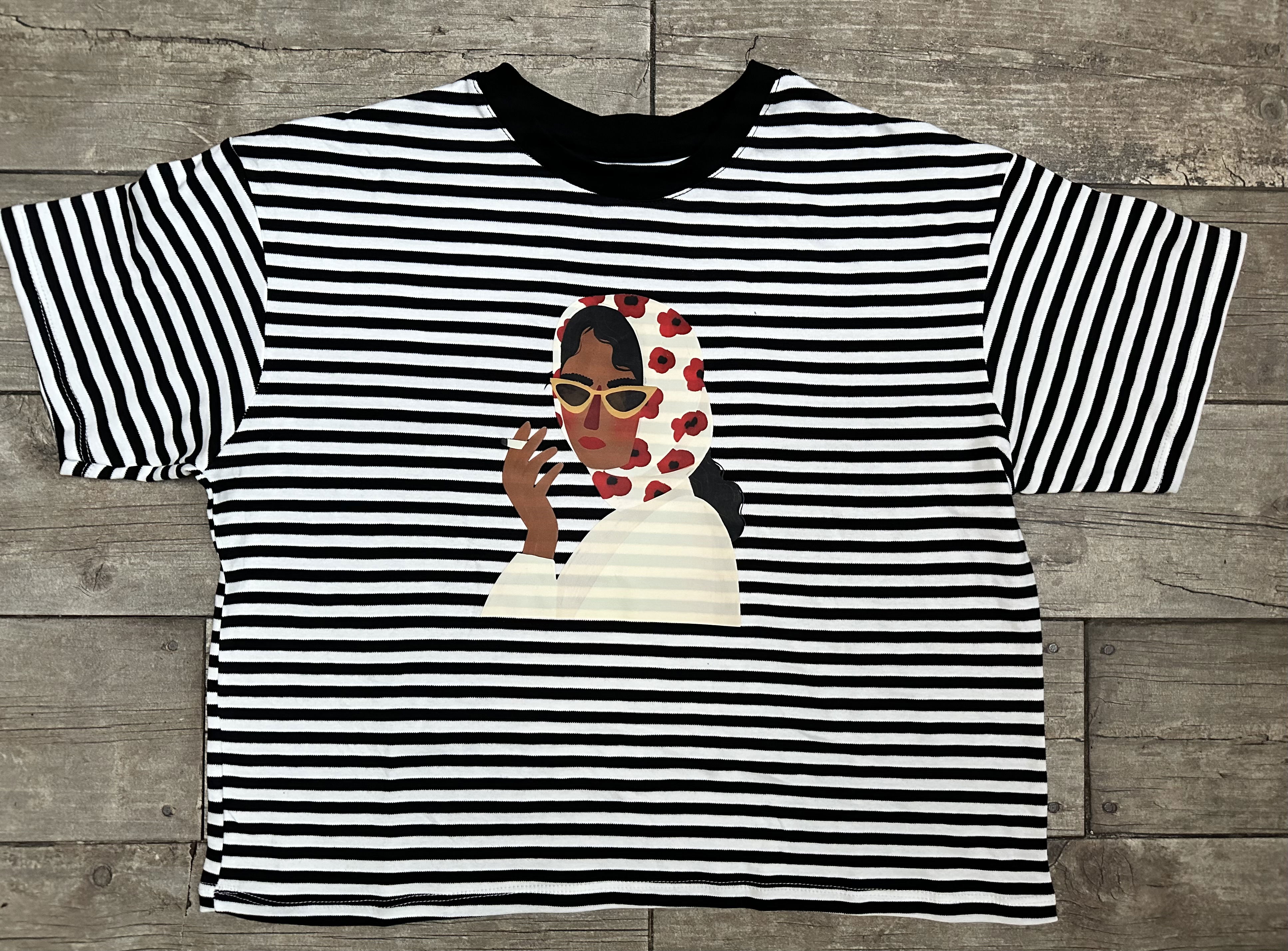 De algodón importado, con corte oversize y cuello negro. Estampa central de una mujer sofisticada con pañuelo y anteojos, que le da un aire retro-glam a toda la prenda.