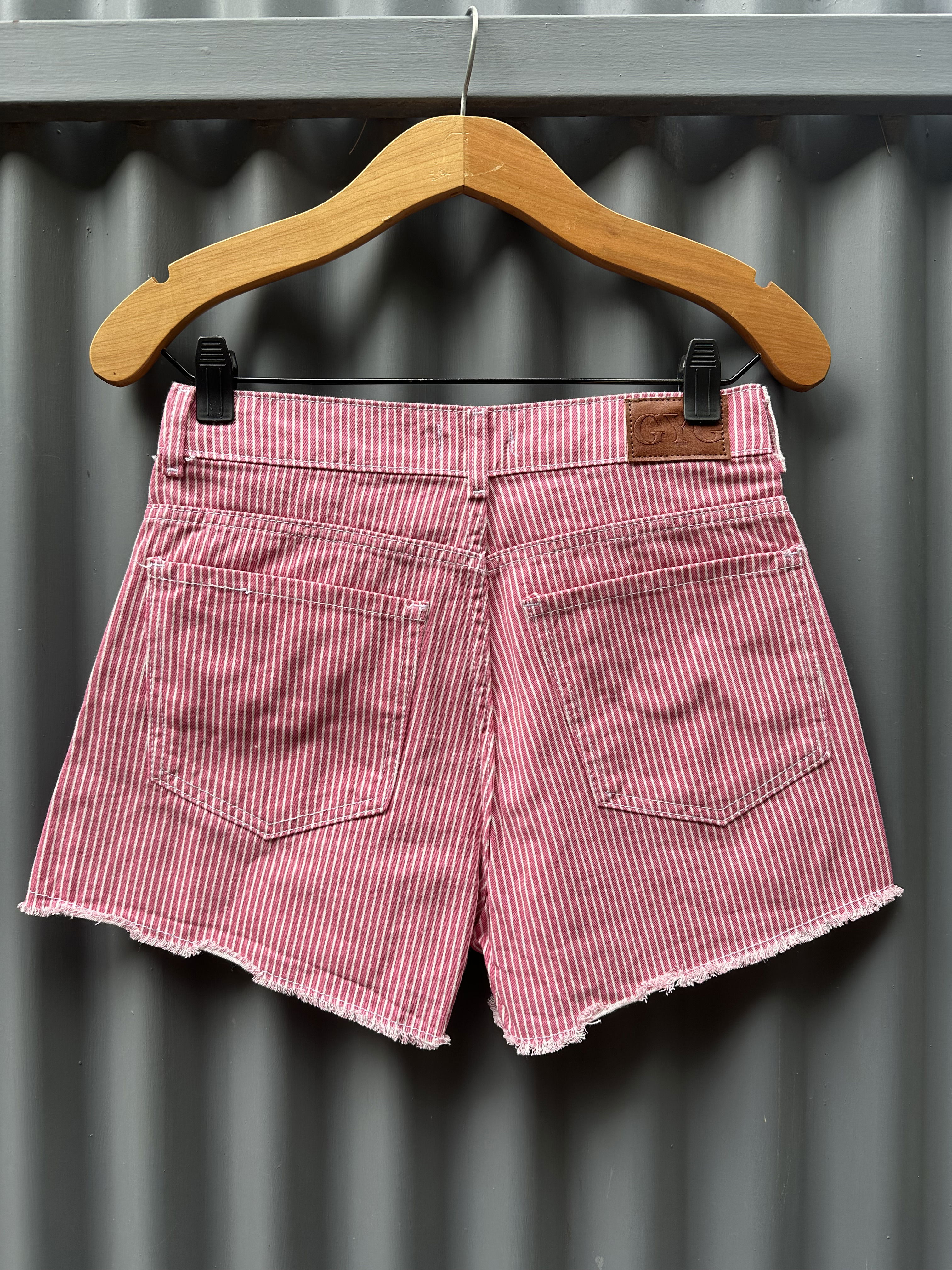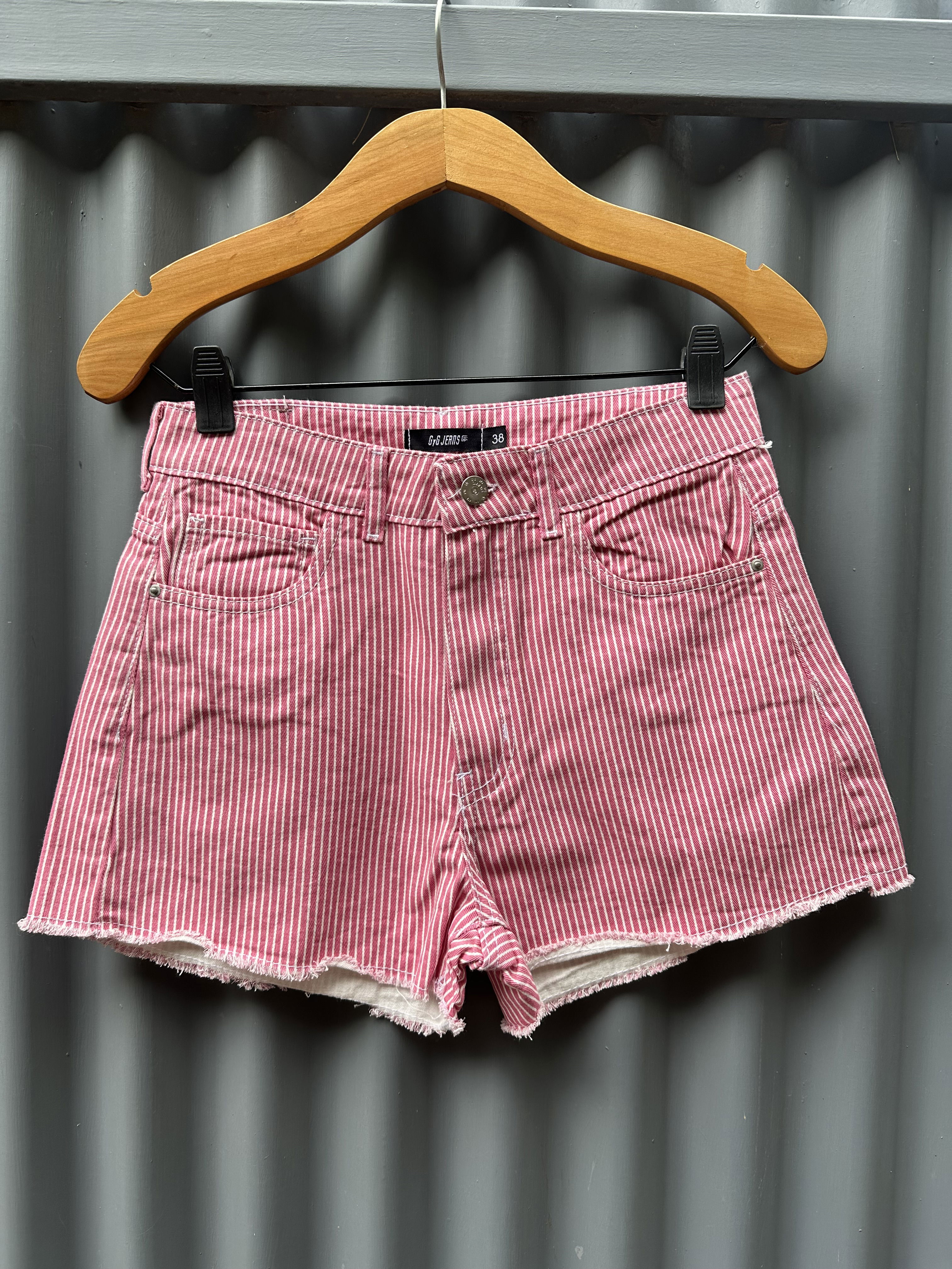 Short de jean coral con rayas blancas, bolsillos y ruedo desflecado. Fresco y versátil para armar distintos looks. Ideal para combinar con una remera básica y zapas, o levantarlo con una camisa suelta y sandalias para la noche.