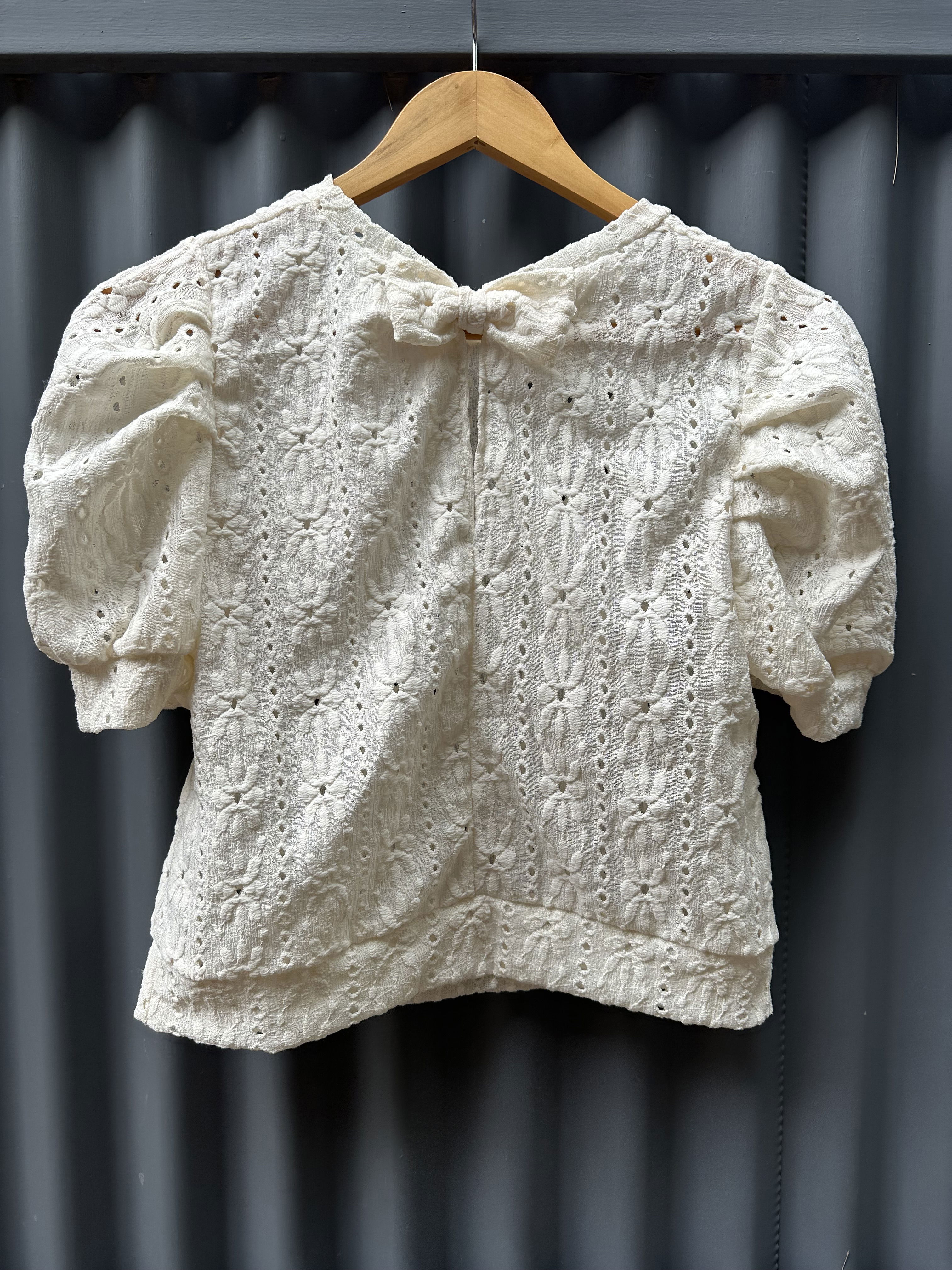 Delicada y soñada. Su textura labrada tipo broderie y el lazo en la espalda la hacen única. Romántica pero fresca, ideal para looks relajados con ese toque especial 💫